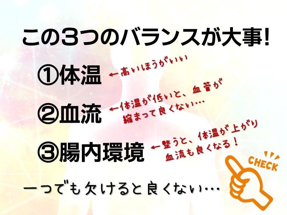 「体温、血流、腸内環境」、この3つにアプローチすることで、健康な体質になるだけでなく、実は、リバウンドしないダイエットにもつながるそう!