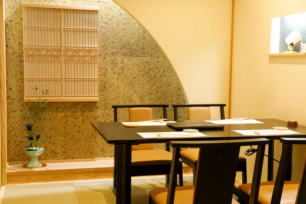 店内はテーブル席で全て個室となっております。 琉球石灰石や檜材をおしみなく贅沢にあしらった和の空間。
