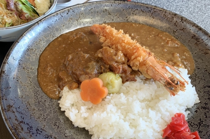 水陸両用車に見立てた有頭海老フライにハンバーグに唐揚げ‥どれもカレーによく合います!