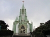 ・平戸市街地の丘の上に平戸ザビエル記念教会の尖鋭な屋根と十字架が特徴
