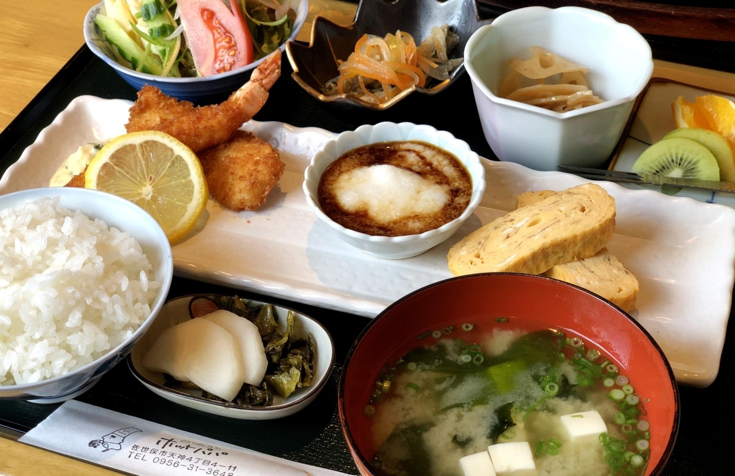 佐世保市天神町の住宅地にある知る人ぞ知る隠れ家的洋食レストラン「四丁目レストラン ホットパパ」の“ハンバーグ&エビフライ定食”です。