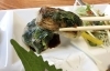 角煮の春巻焼き。春巻の皮と一緒にほうれん草が巻かれていて食感は柔らか。