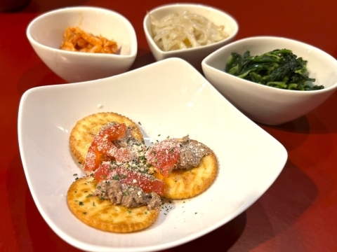 ほうれん草ナムル、もやしナムル、キムチ