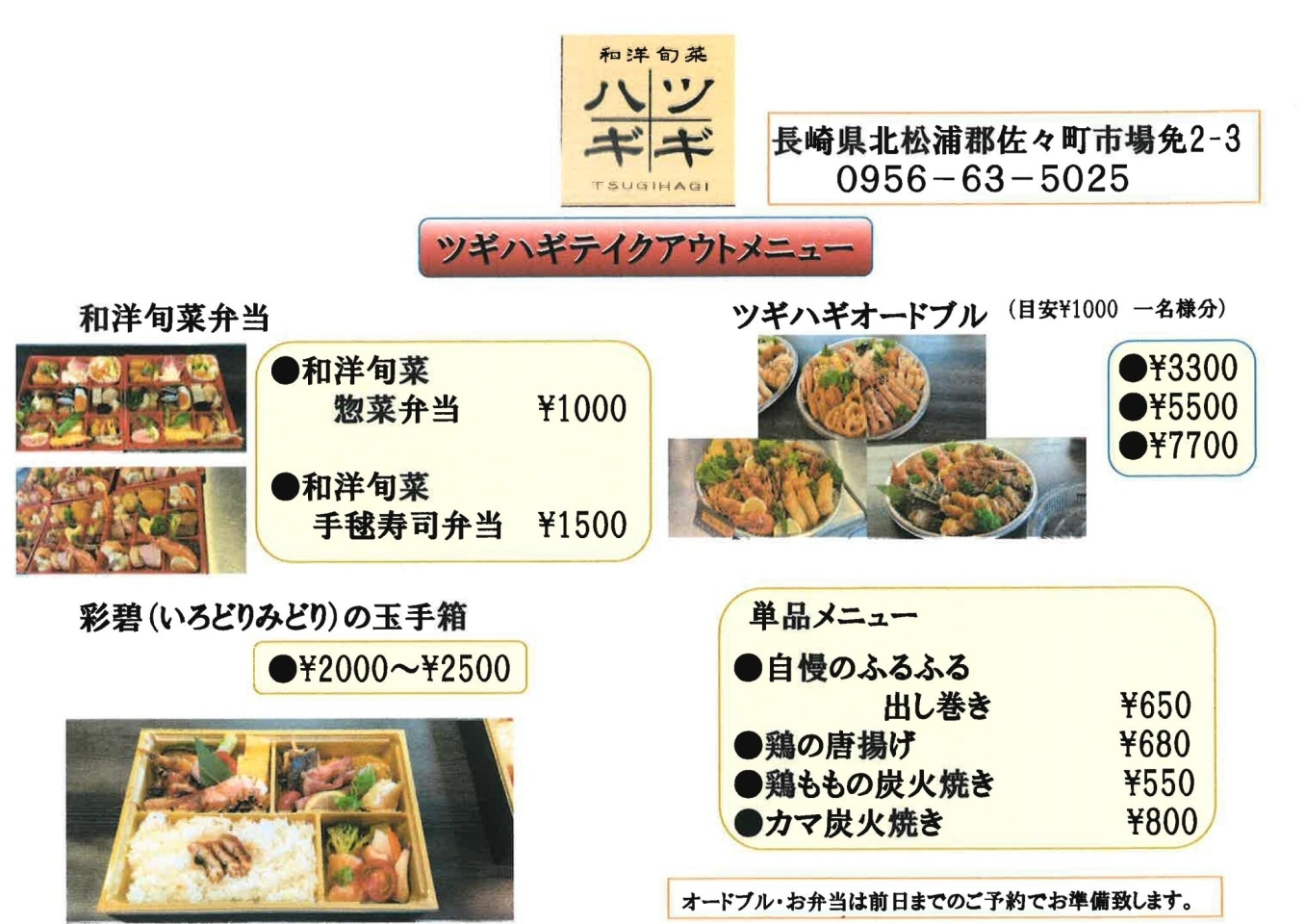 オードブル・お弁当は前日までのご予約でお準備致します。