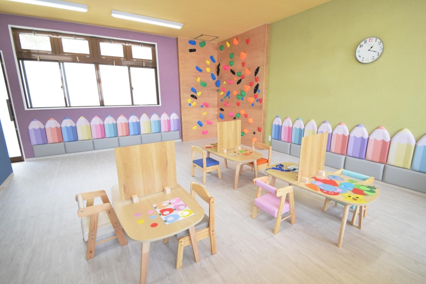 幼児教育に関する豊富な経験と保育士、幼稚園教諭、ビジョントレーナーの資格をもつスタッフが在籍されているだけあって、壁面から、机・イス・トイレに至るまで、かわいいのはもちろん!お子さまの使いやすさ、安全性を考えた室内になっていました!
